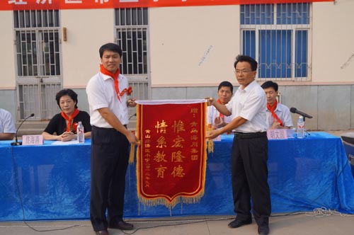 9月20日下午,秋高氣爽、陽光明媚,膠南市黃山經(jīng)濟(jì)區(qū)希望小學(xué)落成儀式在學(xué)校大操場隆重舉行。激昂的國歌聲后,少先隊(duì)員們?yōu)槌鱿I(lǐng)導(dǎo)敬獻(xiàn)紅領(lǐng)巾,以此來表達(dá)孩子們的崇高敬意。一位學(xué)生代表用稚嫩的童音道出了對青島海川建設(shè)集團(tuán)及支持希望工程事業(yè)建設(shè)的各類愛心團(tuán)體的誠摯感謝,和臺下上千名含苞待放,映襯在陽光里的一張張幸福笑臉一樣,他們都是祖國的未來和希望,也讓在場的每一位成年人對“捐資助教、功德無量”這句話有了更深刻的理解和感悟。黃山經(jīng)濟(jì)區(qū)希望小學(xué)校長懷著激動(dòng)地心情向海川集團(tuán)贈(zèng)送錦旗一面,愛心助學(xué)的善舉也贏得了在場師生一次又一次熱烈的掌聲。集團(tuán)黃中坡副總裁代表發(fā)言,他特別指出,今年恰逢集團(tuán)成立60周年之際,本著“節(jié)儉辦大慶”和“注重社會(huì)公益性”的宗旨,集團(tuán)將主要活動(dòng)資金拿出來援建黃山經(jīng)濟(jì)區(qū)中心小學(xué),另外發(fā)動(dòng)企業(yè)職工向老一輩建筑人曾經(jīng)援建過的四川藏族甘孜地區(qū)捐獻(xiàn)衣物。通過一系列與社會(huì)接軌的主題活動(dòng),力爭將本次大慶辦得更有意義。最后他衷心希望膠南市黃山經(jīng)濟(jì)區(qū)中心小學(xué)的全體同學(xué)從小樹立遠(yuǎn)大目標(biāo),刻苦學(xué)習(xí),努力向上,爭做國家棟梁之才,立志回饋社會(huì),報(bào)效祖國。青島團(tuán)市委副書記張海軍和膠南市委副書記佟海燕也出席儀式并與海川集團(tuán)黃中坡副總裁一起為希望小學(xué)揭牌,同時(shí)就海川集團(tuán)對教育公益事業(yè)的傾情參與和大力支持給予了充分肯定和高度評價(jià)。