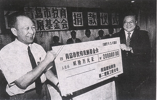 1997年5月28日海川向青島市教育發(fā)展基金會贊助20萬元,設(shè)立青島市首家施工企業(yè)命名的教師素質(zhì)教育基金