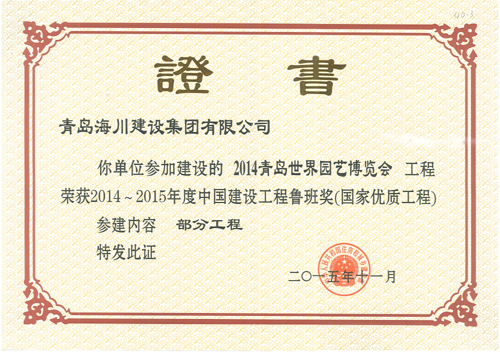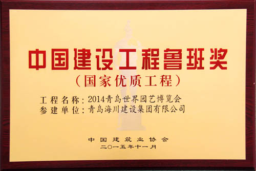 由海川集團(tuán)承建的2014青島世界園藝博覽會(huì)工程榮獲2014-2015年度中國(guó)建設(shè)工程魯班獎(jiǎng)(國(guó)家優(yōu)質(zhì)工程)。表彰大會(huì)于2015年11月16日在北京釣魚(yú)臺(tái)國(guó)賓館舉行,海川建設(shè)集團(tuán)有限公司四分公司主任工程師張棟參加了會(huì)議,并捧回中國(guó)建設(shè)工程魯班獎(jiǎng)(國(guó)家優(yōu)質(zhì)工程)獎(jiǎng)牌及證書(shū)。