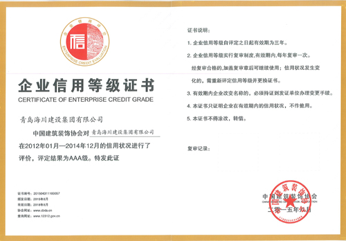 “企業(yè)信用評價AAA級信用企業(yè)” 是中國建筑裝飾協(xié)會遵循公平、公正、公開的原則,為推進企業(yè)社會責任、提升企業(yè)公信力、增強消費者信心、樹立行業(yè)誠信標桿而開展的評選活動,只有行業(yè)內(nèi)規(guī)模較大、市場占有率較高、經(jīng)營效益水平較高,且在業(yè)界具有良好信譽評價的企業(yè)才能最終獲評。青島海川集團憑借規(guī)范的企業(yè)運作和誠信經(jīng)營光榮登榜。